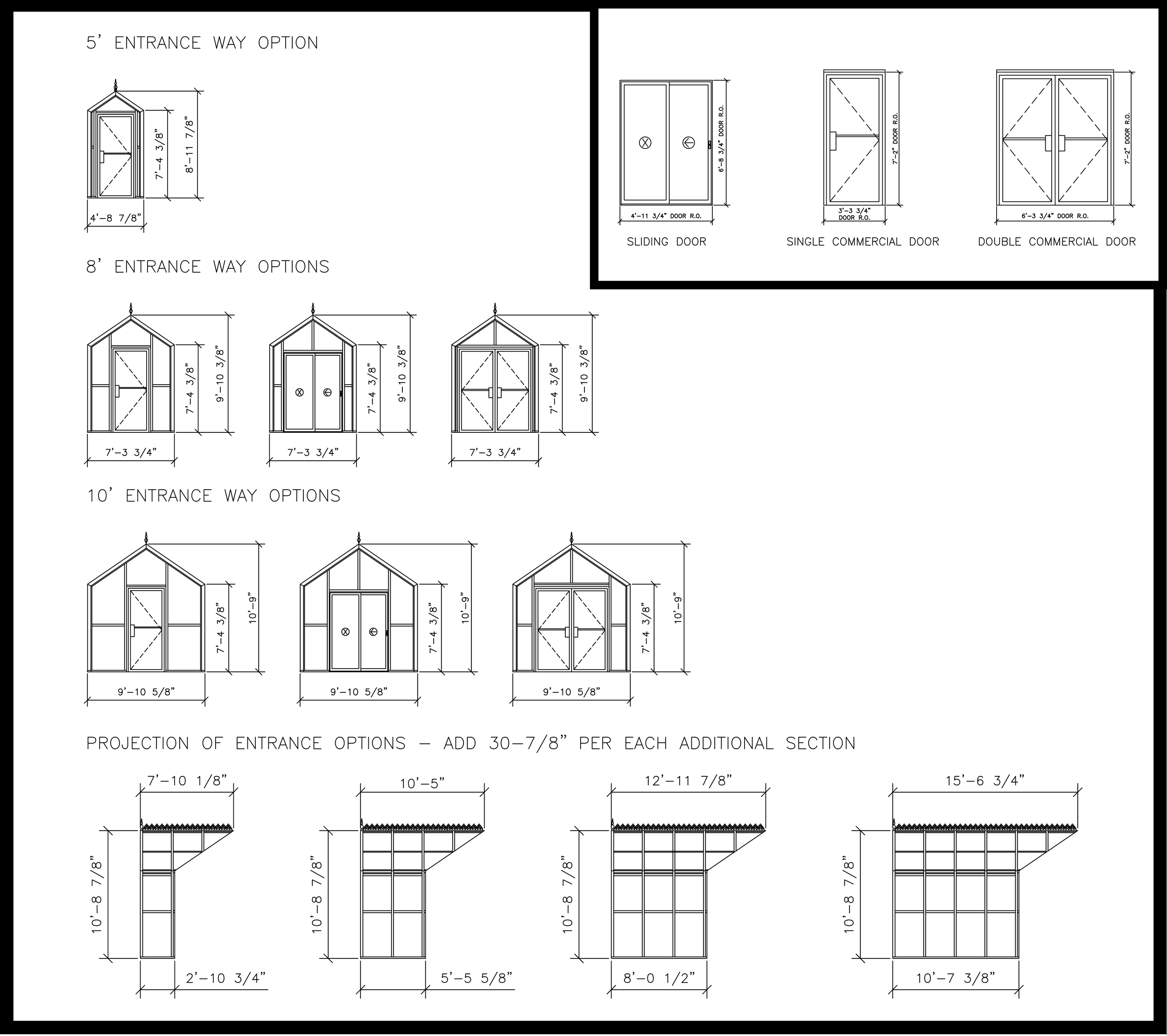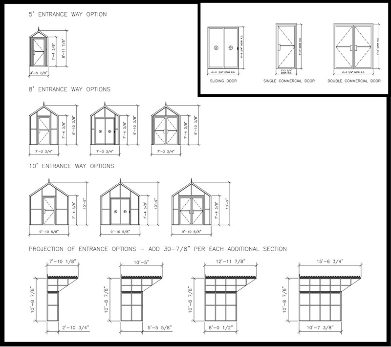 We offer a wide variety of standard sizes: All systems listed below are designed to be 8/12 Pitch standard. To add or delete a section +/- 30 7/8" per section. see chart below click to enlarge image. Add our exclusive F-200 Solar Panel to your Greenhouse Make your new home addition something special. Florian's new product line has been changing the way people look at solar. With projects going up all around the country people are starting to understand Florian's very unique approach towards solar power. Our view of solar power is somewhat different than most. The majority of people in the solar industry take the "cost per watt" point of view, which says "cheaper is better". In contrast, Florian looks to make solar an integral part of the room additions, adding value to your home and also saving you money in the long run. Florian is now "a dual purpose home addition". When you take into account the Federal and possible local rebates the solar equipment is often a free upgrade. These incentives not only help the customer with costly state of the art solar equipment, but can also knock a chunk off the price off the entire project, design, materials, site work and installation! Read more about Florians new solar panel systems - Click Here Custom Entrance Way Designs Custom designs are often requested we are happy to work with you or your architect. Together we can design a room that works best for your home or business. Our motto is "We can build it" See some examples below: