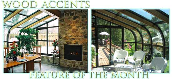 Create a unique atmosphere with a beautifully wood trimmed sunroom addition. Adding wood trim through your room can provide a modern look through it's sharp contrast of wood on aluminum. Also by adding wood accents you can keep Florian's unbeatable thermal integrity system (scroll down to read about our money saving thermal system offered only by Florian). Wood sunrooms are often out of budget due to the intense labor that goes into a wood room but this option offers a economic medium. You receive all the benefits of a wood finish while saving money.. Wood accents can be added to any Sierra Room. In some cases accents merely, for looks and in others for structural integrity. The versatile Sierra Room’s design allows the typical aluminum support as well. Wood accents are one of our most popular design traits and our solely unique to a Florian Sierra Room. Please take a look at our catalog of unique accents & room options as to customize a room to your specifications. |